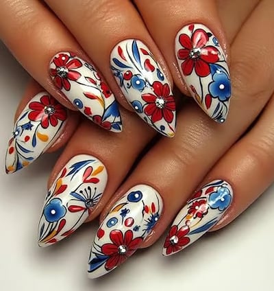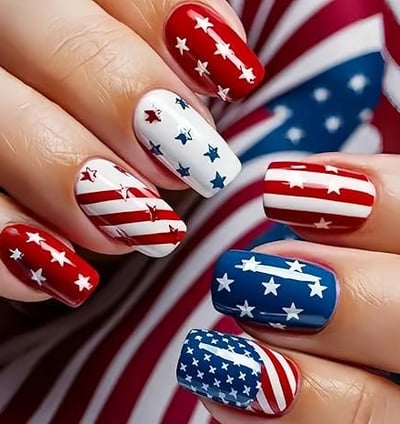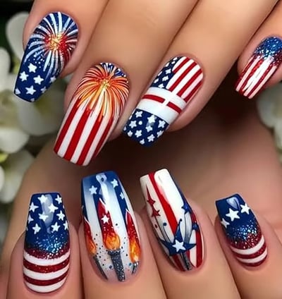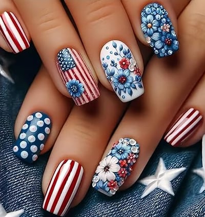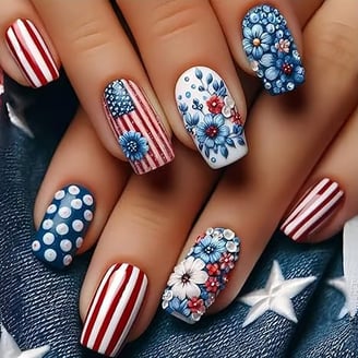 Press on Nails Independence Day Medium Square Fake Nails Blue Flower False Nails for Women Polka Dot Stick on Nails Summer Independence Day Fake Nails Stripe Glue on Nails 24Pcs