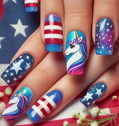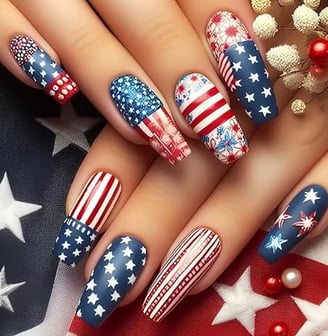 Independence Day Press on Nails Long Coffin Fake Nails with USA Flag Designs 4th of July False Nails Blue Patriotic Acrylic Nails Long Glue on Nails Stars Stick on Nails for Women 24Pcs